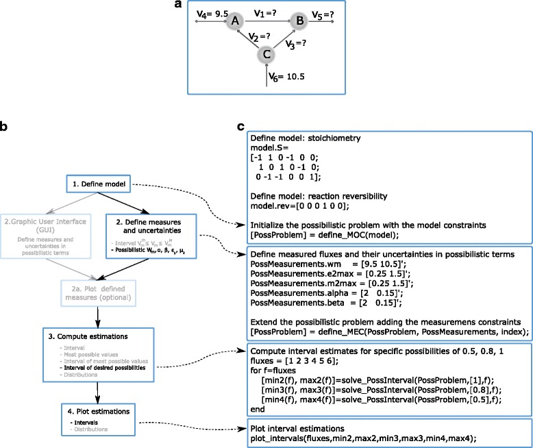 Results: Here we present the PFA (Possibilistic Flux Analysis) Toolbox for MATLAB, which simplifies the use of Interval and Possibilistic Metabolic Flux Analysis. The main features of the PFA Toolbox are the following: (a) It provides reliable MFA estimations in scenarios where only a few fluxes can be measured or those available are imprecise. (b) It provides tools to easily plot the results as interval estimates or flux distributions. (c) It is composed of simple functions that MATLAB users can apply in flexible ways. (d) It includes a Graphical User Interface (GUI), which provides a visual representation of the measurements and their uncertainty. (e) It can use stoichiometric models in COBRA format. In addition, the PFA Toolbox includes a User's Guide with a thorough description of its functions and several examples.