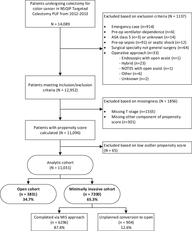 Materials and methods: Patients undergoing nonemergent colectomy for colon cancer in 2012 and 2013 were selected from the American College of Surgeons National Surgical Quality Improvement Program (ACS-NSQIP) targeted colectomy participant use file. Patients were divided into two cohorts based on operative approach-open versus minimally invasive surgery (MIS). Univariate, multivariate, and propensity-adjusted multivariate analyses were performed to compare postoperative outcomes between the two groups.