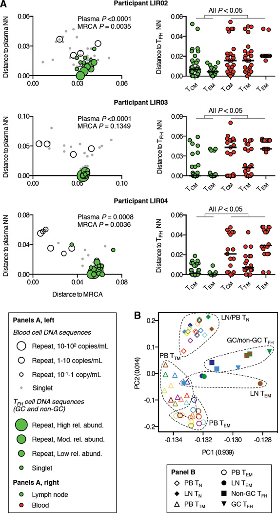 Targeted HIV cure strategies require definition of the mechanisms that maintain the virus. Here, we tracked HIV replication and the persistence of infected CD4 T cells in individuals with natural virologic control by sequencing viruses, T cell receptor genes, HIV integration sites, and cellular transcriptomes. Our results revealed three mechanisms of HIV persistence operating within distinct anatomic and functional compartments. In lymph node, we detected viruses with genetic and transcriptional attributes of active replication in both T follicular helper (TFH) cells and non-TFH memory cells. In blood, we detected inducible proviruses of archival origin among highly differentiated, clonally expanded cells. Linking the lymph node and blood was a small population of circulating cells harboring inducible proviruses of recent origin. Thus, HIV replication in lymphoid tissue, clonal expansion of infected cells, and recirculation of recently infected cells act together to maintain the virus in HIV controllers despite effective antiviral immunity.