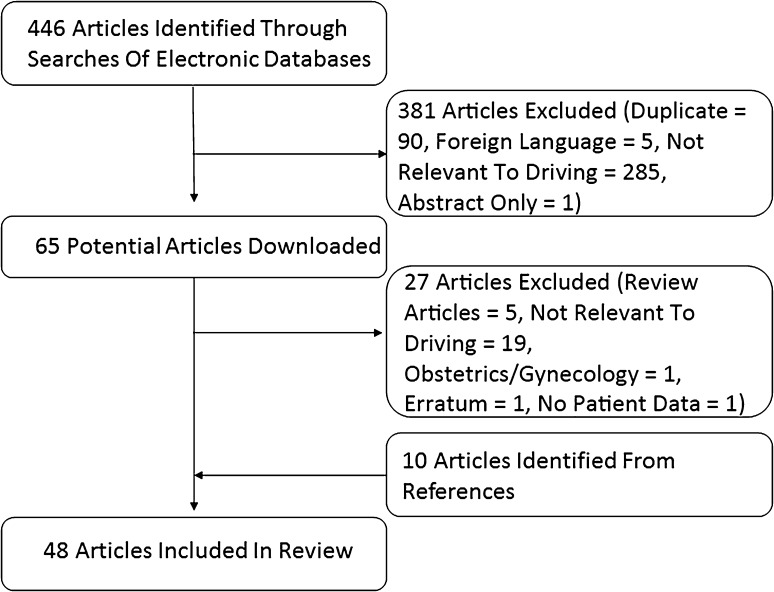 Methods: A search was performed using PubMed and EMBASE®, with a list of 20 common orthopaedic procedures and the words "driving" and "brake". Selection criteria included any article that evaluated driver safety or time to driving after major orthopaedic surgery or immobilization using observer-reported outcome measures or survey data. A total of 446 articles were identified from the initial search, 48 of which met inclusion criteria; abstract-only publications and non-English-language articles were not included. The evidence base includes data for driving safety on foot, ankle, spine, and leg injuries, knee and shoulder arthroscopy, hip and knee arthroplasty, carpal tunnel surgery, and extremity immobilization. Thirty-four of the articles used observer-reported outcome measures such as total brake time, brake response time, driving simulator, and standardized driving track results, whereas the remaining 14 used survey data.