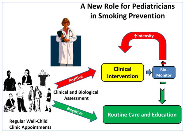 Adolescence presents a critical opportunity to support the development of healthy patterns of behavior and prevent future health problems. Unfortunately, there is not yet a well-developed prevention model that allows pediatricians to initiate and monitor prevention efforts for the substantial minority of individuals who engage in risky behavior during adolescence. We suggest that recently developed epigenetic technologies may provide a bridge to a new prevention paradigm in which pediatricians screen for indicated smoking prevention services. Specifically, since currently available tobacco use screening measures are insensitive to low levels of use, newly developed methylation based approaches may enhance the sensitivity of the initial screening for nascent smoking behavior as well monitoring of outcomes. We conclude that the incorporation of Next Gen screening technologies into standard pediatric evaluations may allow for more effective referral to prevention programming for tobacco use. In addition to the potential direct impact on long-term enhancement of health outcomes secondary to smoking prevention, well-established links between smoking and other risk behaviors suggest that expanded referral for nascent smoking may also create opportunities to address other risky adolescent behaviors, and so decrease several interrelated drivers of long-term health care costs.