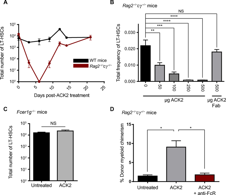 Hematopoietic stem cell (HSC) transplantation can cure diverse diseases of the blood system, including hematologic malignancies, anemias, and autoimmune disorders. However, patients must undergo toxic conditioning regimens that use chemotherapy and/or radiation to eliminate host HSCs and enable donor HSC engraftment. Previous studies have shown that anti-c-Kit monoclonal antibodies deplete HSCs from bone marrow niches, allowing donor HSC engraftment in immunodeficient mice. We show that host HSC clearance is dependent on Fc-mediated antibody effector functions, and enhancing effector activity through blockade of CD47, a myeloid-specific immune checkpoint, extends anti-c-Kit conditioning to fully immunocompetent mice. The combined treatment leads to elimination of >99% of host HSCs and robust multilineage blood reconstitution after HSC transplantation. This targeted conditioning regimen that uses only biologic agents has the potential to transform the practice of HSC transplantation and enable its use in a wider spectrum of patients.
