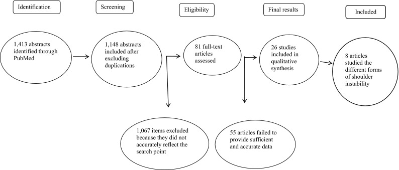 Materials and methods: A systematic review of the English literature was performed using the PubMED database throughout January 2014. This review was guided, conducted and reported according to PRISMA criteria. The criteria for inclusion in the study were (1) the article was written in English, (2) the level of evidence was 1-4, (3) the article was available in full text, (4) the article investigated the natural history or course of shoulder instability, the outcome of non-operative management, or the regression of the shoulder symptoms to the mean. The methodological quality of each included study was individually assessed using a newly developed general assessment tool-Assessing the Methodological Quality of Published Papers (AMQPP).