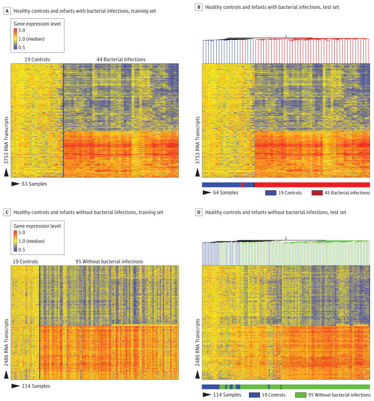 Results: Of 1883 febrile infants (median age, 37 days; 55.7% boys), RNA biosignatures were measured in 279 randomly selected infants (89 with bacterial infections-including 32 with bacteremia and 15 with urinary tract infections-and 190 without bacterial infections), and 19 afebrile healthy infants. Sixty-six classifier genes were identified that distinguished infants with and without bacterial infections in the test set with 87% (95% CI, 73%-95%) sensitivity and 89% (95% CI, 81%-93%) specificity. Ten classifier genes distinguished infants with bacteremia from those without bacterial infections in the test set with 94% (95% CI, 70%-100%) sensitivity and 95% (95% CI, 88%-98%) specificity. The incremental C statistic for the RNA biosignatures over the YOS score was 0.37 (95% CI, 0.30-0.43).