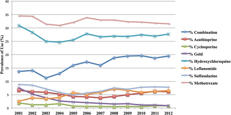 Results: The incidence rate of treatment was calculated at an average of 127.5 cases per 100,000 population between 2001 and 2012, and the cumulative prevalence, accounting for patients lost to the database, increased and then stabilized at 1.3 % in the last three years of the study. Annual dispensation of methotrexate, combination DMARD therapy and biologic therapy approached 35 %, 19 %, and 10 % of the cohort respectively. A declining prevalence of claims for acetaminophen (28 % to 15 %) and anti-inflammatories (73 % to 63 %) occurred from 2000 to 2012, however corticosteroid (32 %) and opioid (65 %) dispensation remained stable. The proportion of patients with claims for NSAIDs (69.9 % to 61.1 %, p = 0.002), oral corticosteroids (45.4 % to 33.6 %, p < 0.001) and parenteral corticosteroids (16.2 % to 8.3 %, p = 0.002) decreased in the 6 months following biologic initiation.