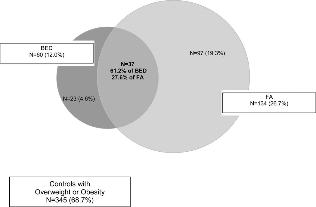 Results: Among 502 participants with overweight/obesity, 43 (8.5%) met BED criteria, 84 (16.6%) met FA criteria, 51 (10.1%) met both BED + FA criteria, and 328 (64.8%) met neither (control). The three groups with eating pathology (BED, FA, and BED + FA) had significantly greater disturbances on most measures (eating disorder psychopathology, impulsivity, and self-control) than the control group, while the FA and BED + FA groups reported significantly higher depression scores relative to the control group. The three eating groups did not differ significantly from each other.