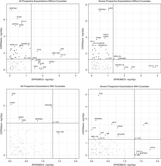 Methods: Subjects from the SPIROMICS (Subpopulations and Intermediate Outcomes Measures in COPD Study) (n = 1,544) and COPDGene (Genetic Epidemiology of COPD) (n = 602) cohorts had 90 plasma or serum candidate proteins measured on study entry using Myriad-RBM multiplex panels. We defined total exacerbations as subject-reported worsening in respiratory health requiring therapy with corticosteroids and/or antibiotics, and severe exacerbations as those leading to hospitalizations or emergency room visits. We assessed retrospective exacerbations during the 12 months before enrollment and then documented prospective exacerbations in each cohort. Exacerbations were modeled for biomarker associations with negative binomial regression including clinical covariates (age, sex, percent predicted FEV1, self-reported gastroesophageal reflux, St. George's Respiratory Questionnaire score, smoking status). We used the Stouffer-Liptak test to combine P values for metaanalysis.
