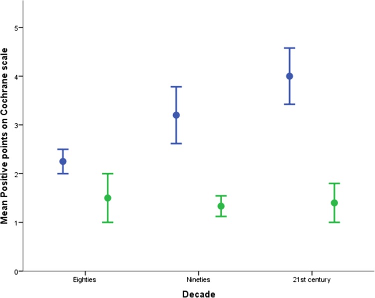 Methods: The MEDLINE and EMBASE database were searched for both RCTs and cohort studies. The original studies were divided into decades of publication over the last 30 years. The methodological quality of the studies was assessed using the 'traditional' risk of bias assessment tool provided by The Cochrane Collaboration and the 'newer' MINORS criteria.