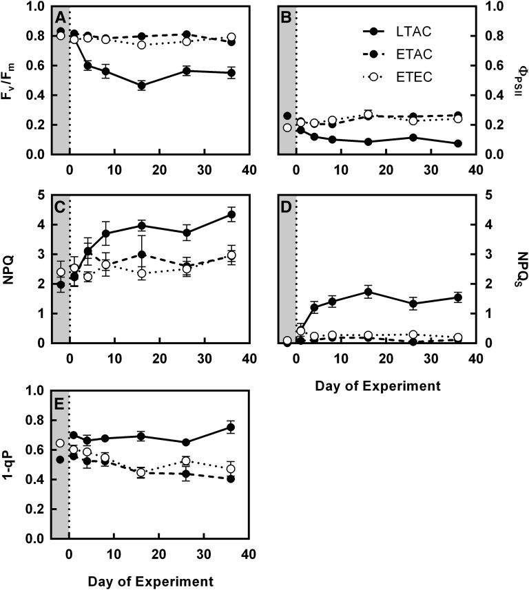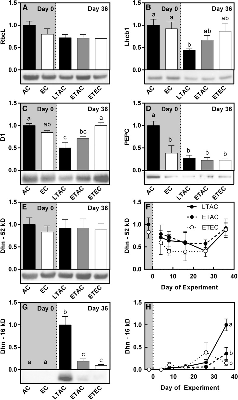 Rising global temperature and CO2 levels may sustain late-season net photosynthesis of evergreen conifers but could also impair the development of cold hardiness. Our study investigated how elevated temperature, and the combination of elevated temperature with elevated CO2, affected photosynthetic rates, leaf carbohydrates, freezing tolerance, and proteins involved in photosynthesis and cold hardening in Eastern white pine (Pinus strobus). We designed an experiment where control seedlings were acclimated to long photoperiod (day/night 14/10 h), warm temperature (22°C/15°C), and either ambient (400 μL L-1) or elevated (800 μmol mol-1) CO2, and then shifted seedlings to growth conditions with short photoperiod (8/16 h) and low temperature/ambient CO2 (LTAC), elevated temperature/ambient CO2 (ETAC), or elevated temperature/elevated CO2 (ETEC). Exposure to LTAC induced down-regulation of photosynthesis, development of sustained nonphotochemical quenching, accumulation of soluble carbohydrates, expression of a 16-kD dehydrin absent under long photoperiod, and increased freezing tolerance. In ETAC seedlings, photosynthesis was not down-regulated, while accumulation of soluble carbohydrates, dehydrin expression, and freezing tolerance were impaired. ETEC seedlings revealed increased photosynthesis and improved water use efficiency but impaired dehydrin expression and freezing tolerance similar to ETAC seedlings. Sixteen-kilodalton dehydrin expression strongly correlated with increases in freezing tolerance, suggesting its involvement in the development of cold hardiness in P. strobus Our findings suggest that exposure to elevated temperature and CO2 during autumn can delay down-regulation of photosynthesis and stimulate late-season net photosynthesis in P. strobus seedlings. However, this comes at the cost of impaired freezing tolerance. Elevated temperature and CO2 also impaired freezing tolerance. However, unless the frequency and timing of extreme low-temperature events changes, this is unlikely to increase risk of freezing damage in P. strobus seedlings.