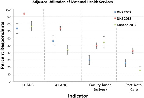Methods: We assessed trends in healthcare utilization among the national rural population using the Liberian Demographic and Health Survey (DHS) from 2007 and 2013. We compared these results to results obtained from a two-staged cluster survey in 2012 in the district of Konobo, Liberia, to assess for differential health utilization in an isolated, remote region. Our primary outcomes of interest were maternal and child health service care seeking and utilization.