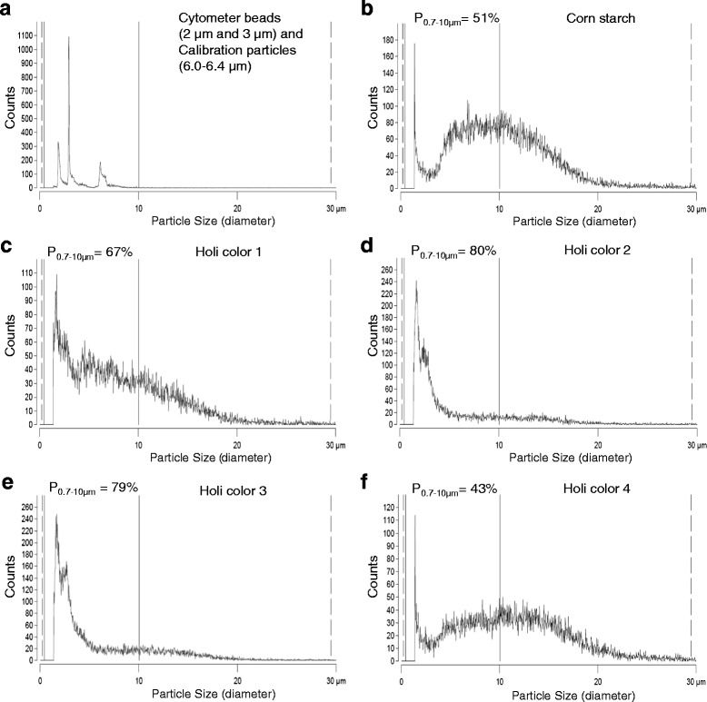 Results: We show here that all tested Holi colours consist to more than 40 % of particles with an aerodynamic diameter smaller than 10 μm, so called PM10 particles (PM, particulate matter). Two of the analysed Holi powders contained even more than 75 % of PM10 particles. Furthermore we demonstrate in cell culture experiments that Holi colours can induce the production of the pro-inflammatory cytokines TNF-α (Tumor necrosis factor-α), IL-6 (Interleukine-6) and IL-1β (Interleukine-1β). Three out of the four analysed colours induced a significantly higher cytokine response in human PBMCs (Peripheral Blood Mononuclear Cells) and whole blood than corn starch, which is often used as carrier substance for Holi colours. Moreover we show that corn starch and two Holi colours contain endotoxin and that certain Holi colours display concentration dependent cytotoxic effects in higher concentration. Furthermore we reveal that in principle Holi colours and corn starch are able to generate an oxidative burst in human granulocytes and monocytes. In Holi colour 1 we detected a fungal contamination.