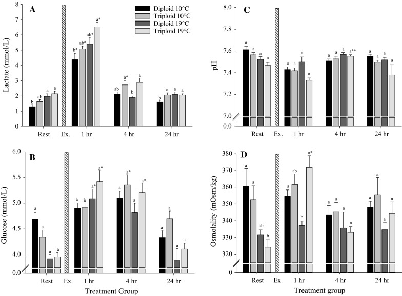 The physiological effect of temperature on feed intake and haematological parameters after exhaustive swimming in diploid and triploid brown trout (Salmo trutta) was investigated. Trout were exposed to an incremental temperature challenge (2 °C/day) from ambient (6 °C) to either 10 or 19 °C. Feed intake profiles did not differ between ploidy at 10 °C; however, triploids had a significantly higher total feed intake at 19 °C. After 24 days, each temperature-ploidy group was exposed to exhaustive swimming for 10 min. The haematological response differed between ploidy, with the magnitude of the response affected by temperature and ploidy. Post-exercise, acid-base and ionic differences were observed. Plasma lactate increased significantly from rest for both temperature and ploidy groups, but glucose increased significantly at higher temperature. Post-exercise, triploids at 19 °C had significantly higher osmolality and cholesterol than diploids, but differences were resumed within 4 h. Elevated alkaline phosphatase (ALP) and aspartate aminotransferase (AST) in fish at higher temperature suggested greater tissue damage; however, both ploidy responded similarly. Despite no significant differences in deformity prevalence, the type and location of deformities observed differed between ploidy (decreased intervertebral space with higher prevalence in tail area and fin regions for diploids, while vertebral compression, fusion in cranial and caudal trunks for triploids). These results suggest triploids have greater appetite than diploids at elevated temperature and that triploids suffer similar blood disturbances after exercise as diploids. These findings have implications for the management of freshwater ecosystems and suggest that stocking triploid brown trout may offer an alternative to diploid brown trout.