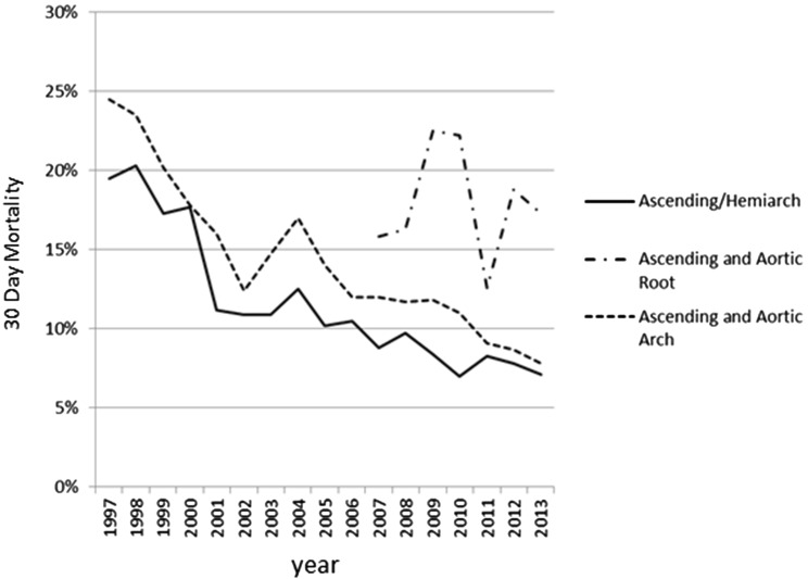 - Pape LA, Awais M, Woznicki EM, Suzuki T, Trimarchi S, Evangelista A, et al. Presentation, diagnosis, and outcomes of acute aortic dissection: 17-year trends from the international registry of acute aortic dissection. J Am Coll Cardiol. 2015;66:350–358. doi: 10.1016/j.jacc.2015.05.029. - DOI - PubMed
