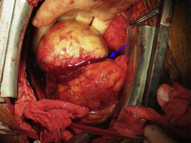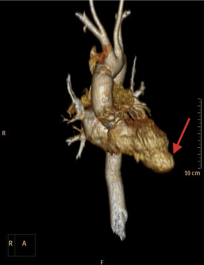 Presentation of case: We report a case of a 49-year-old male with Marfan Syndrome who was admitted to the cardiology department with a four day history of shortness of breath and associated dull, non-radiating chest pain. Past history included a previous Bentall procedure for a type-A aortic dissection and coronary artery bypass grafting involving a saphenous vein graft to the right coronary artery. A computed tomography (CT) scan showed a round, heterogeneous mass measuring 14×9cm with lobulated contours, situated adjacent to the left ventricle along the left posterior region of the aorta. The mass was resected and further dissection revealed a plastic band harboured from the core of the mass.