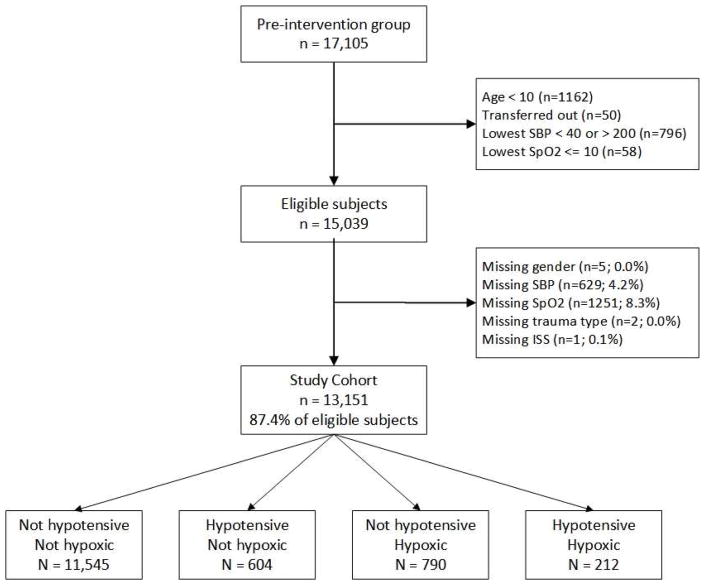 Results: Among the 13,151 patients who met inclusion criteria (median age 45 years; 68.6% men), 11,545 (87.8%) had neither hypotension nor hypoxia, 604 (4.6%) had hypotension only, 790 (6.0%) had hypoxia only, and 212 (1.6%) had both hypotension and hypoxia. Mortality for the 4 study cohorts was 5.6%, 20.7%, 28.1%, and 43.9%, respectively. The crude and adjusted odds ratios for death within the cohorts, using the patients with neither hypotension nor hypoxia as the reference, were 4.4 and 2.5, 6.6 and 3.0, and 13.2 and 6.1, respectively. Evaluation for an interaction between hypotension and hypoxia revealed that the effects were additive on the log odds of death.