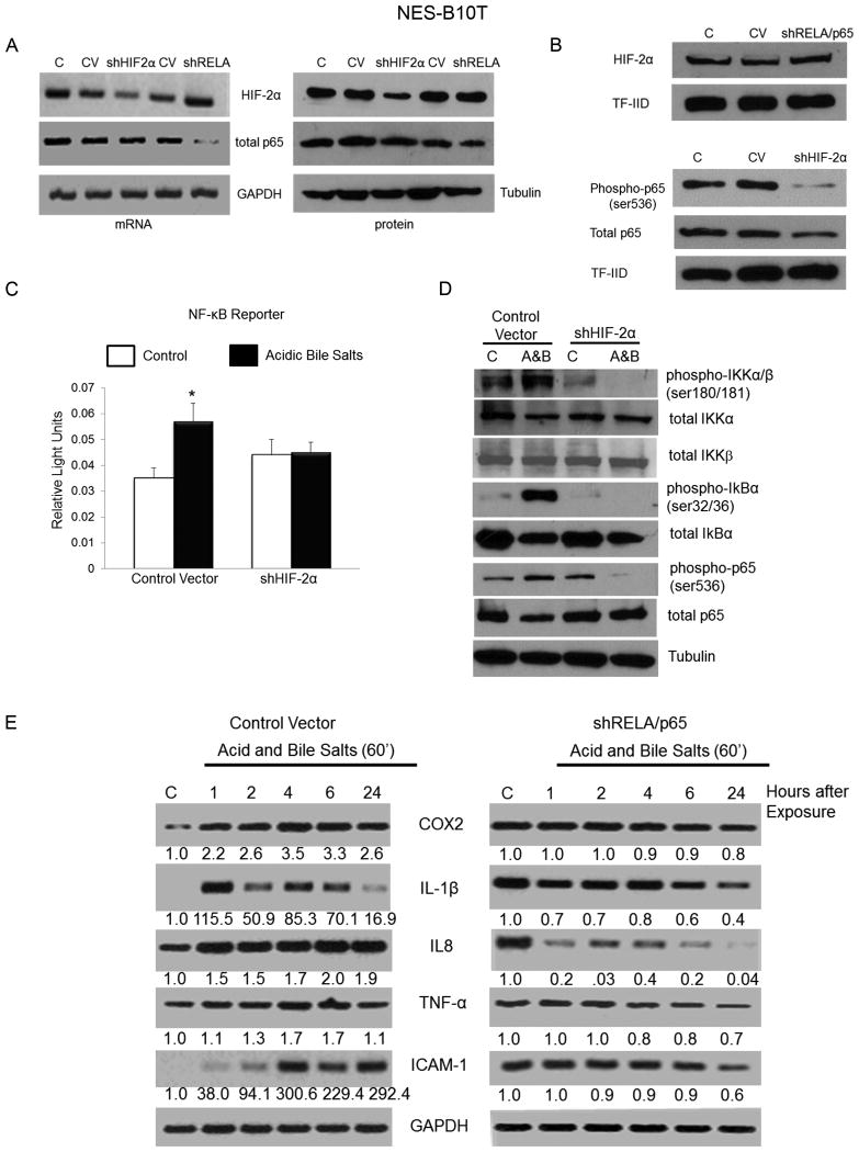 Conclusions: In patients developing RO, increases in oesophageal HIF-2α correlate with increased pro-inflammatory molecule expression. In oesophageal epithelial cells, acidic bile salts stabilise HIF-2α, which mediates expression of pro-inflammatory molecules. HIF-2α appears to have a role in RO pathogenesis.