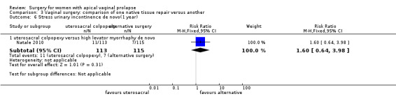 Main results: We included 30 RCTs (3414 women) comparing surgical procedures for apical vaginal prolapse. Evidence quality ranged from low to moderate. Limitations included imprecision, poor methodological reporting and inconsistency. Vaginal procedures versus sacral colpopexy (six RCTs, n = 583; one to four-year review). Awareness of prolapse was more common after vaginal procedures (risk ratio (RR) 2.11, 95% confidence interval (CI) 1.06 to 4.21, 3 RCTs, n = 277, I2 = 0%, moderate-quality evidence). If 7% of women are aware of prolapse after sacral colpopexy, 14% (7% to 27%) are likely to be aware after vaginal procedures. Repeat surgery for prolapse was more common after vaginal procedures (RR 2.28, 95% CI 1.20 to 4.32; 4 RCTs, n = 383, I2 = 0%, moderate-quality evidence). The confidence interval suggests that if 4% of women require repeat prolapse surgery after sacral colpopexy, between 5% and 18% would require it after vaginal procedures.We found no conclusive evidence that vaginal procedures increaserepeat surgery for stress urinary incontinence (SUI) (RR 1.87, 95% CI 0.72 to 4.86; 4 RCTs, n = 395; I2 = 0%, moderate-quality evidence). If 3% of women require repeat surgery for SUI after sacral colpopexy, between 2% and 16% are likely to do so after vaginal procedures. Recurrent prolapse is probably more common after vaginal procedures (RR 1.89, 95% CI 1.33 to 2.70; 4 RCTs, n = 390; I2 = 41%, moderate-quality evidence). If 23% of women have recurrent prolapse after sacral colpopexy, about 41% (31% to 63%) are likely to do so after vaginal procedures.The effect of vaginal procedures on bladder injury was uncertain (RR 0.57, 95% CI 0.14 to 2.36; 5 RCTs, n = 511; I2 = 0%, moderate-quality evidence). SUI was more common after vaginal procedures (RR 1.86, 95% CI 1.17 to 2.94; 3 RCTs, n = 263; I2 = 0%, moderate-quality evidence). Dyspareunia was also more common after vaginal procedures (RR 2.53, 95% CI 1.17 to 5.50; 3 RCTs, n = 106, I2 = 43%, low-quality evidence). Vaginal surgery with mesh versus without mesh (6 RCTs, n = 598, 1-3 year review). Awareness of prolapse - There may be little or no difference between the groups for this outcome (RR 1.08 95% CI 0.35 to 3.30 1 RCT n = 54, low quality evidence). The confidence interval was wide suggesting that if 18% of women are aware of prolapse after surgery without mesh, between 6% and 59% will be aware of prolapse after surgery with mesh. Repeat surgery for prolapse - There may be little or no difference between the groups for this outcome (RR 0.69, 95% CI 0.30 to 1.60; 5 RCTs, n = 497; I2 = 9%, low-quality evidence). If 4% of women require repeat surgery for prolapse after surgery without mesh, 1% to 7% are likely to do so after surgery with mesh.We found no conclusive evidence that surgery with mesh increases repeat surgery for SUI (RR 4.91, 95% CI 0.86 to 27.94; 2 RCTs, n = 220; I2 = 0%, low-quality evidence). The confidence interval was wide suggesting that if 2% of women require repeat surgery for SUI after vaginal colpopexy without mesh, 2% to 53% are likely to do so after surgery with mesh.We found no clear evidence that surgery with mesh decreases recurrent prolapse (RR 0.36, 95% CI 0.09 to 1.40; 3 RCTs n = 269; I2 = 91%, low-quality evidence). The confidence interval was very wide and there was serious inconsistency between the studies. Other outcomes There is probably little or no difference between the groups in rates of SUI (de novo) (RR 1.37, 95% CI 0.94 to 1.99; 4 RCTs, n = 295; I2 = 0%, moderate-quality evidence) or dyspareunia (RR 1.21, 95% CI 0.55 to 2.66; 5 RCTs, n = 501; I2 = 0% moderate-quality evidence). We are uncertain whether there is any difference for bladder injury (RR 3.00, 95% CI 0.91 to 9.89; 4 RCTs, n = 445; I2 = 0%; very low-quality evidence). Vaginal hysterectomy versus alternatives for uterine prolapse (six studies, n = 667)No clear conclusions could be reached from the available evidence, though one RCT found that awareness of prolapse was less likely after hysterectomy than after abdominal sacrohysteropexy (RR 0.38, 955 CI 0.15 to 0.98, n = 84, moderate-quality evidence).Other comparisonsThere was no evidence of a difference for any of our primary review outcomes between different types of vaginal native tissue repair (two RCTs), comparisons of graft materials for vaginal support (two RCTs), different routes for sacral colpopexy (four RCTs), or between sacral colpopexy with and without continence surgery (four RCTs).