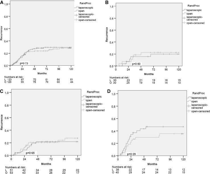 Results: In total, 1248 patients were randomised, of which 329 were Dutch. Fifty-eight Dutch patients were excluded and 15 were lost to follow-up, leaving 256 patients for 10-year analysis. Median follow-up was 112 months. Disease-free survival rates were 45.2 % in the laparoscopic group and 43.2 % in the open group (difference 2.0 %; 95 % confidence interval (CI) -10.3 to 14.3; p = 0.96). Overall survival rates were 48.4 and 46.7 %, respectively (difference 1.7 %; 95 % CI -10.6 to 14.0; p = 0.83). Stage-specific analysis revealed similar survival rates for both groups. Sixty-two patients were diagnosed with recurrent disease, accounting for 29.4 % in the laparoscopic group and 28.2 % in the open group (difference 1.2 %; 95 % CI -11.1 to 13.5; p = 0.73). Seven patients had port- or wound-site recurrences (laparoscopic n = 3 vs. open n = 4).