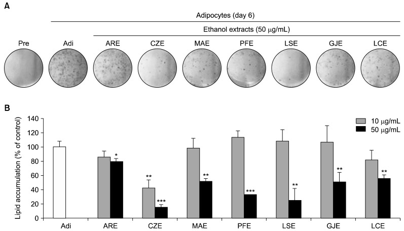 Obesity is a major risk factor for various metabolic diseases such as cardiovascular disease, hypertension, and type 2 diabetes mellitus. In this study, we prepared ethanol extracts from Agastache rugosa (ARE), Chrysanthemum zawadskii (CZE), Mentha arvensis (MAE), Perilla frutescens (PFE), Leonurus sibiricus (LSE), Gardenia jasminoides (GJE), and Lycopus coreanus (LCE). The anti-oxidant and anti-adipogenic effects were evaluated. The IC50 values for ascorbic acid and LCE against 2,2-diphenyl-1-picrylhydrazyl radicals were 246.2 μg/mL and 166.2 μg/mL, respectively, followed by ARE (186.6 μg/mL), CZE (198.6 μg/mL), MAE (337.1 μg/mL), PFE (415.3 μg/mL), LSE (548.2 μg/mL), and GJE (626.3 μg/mL). In non-toxic concentration ranges, CZE had a strong inhibitory effect against 3T3-L1 adipogenes (84.5%) than those of the other extracts. Furthermore, the anti-adipogenic effect of CZE is largely limited in the early stage of adipogenesis, and we revealed that the inhibitory role of CZE in adipogenesis is required for the activation of Wnt signaling. Our results provide scientific evidence that the anti-adipogenic effect of CZE can be applied as an ingredient for the development of functional foods and nutri-cosmetics for obesity prevention.