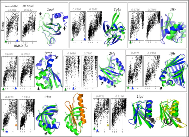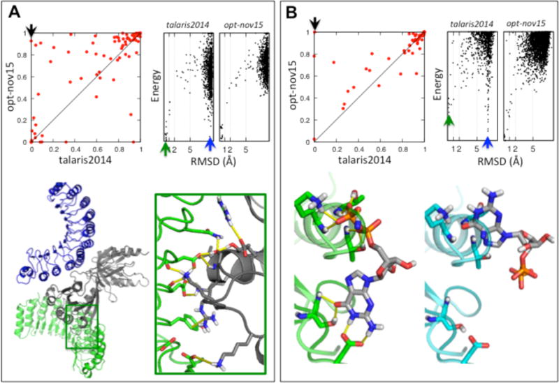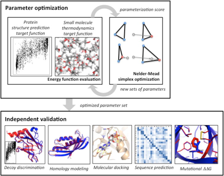 Most biomolecular modeling energy functions for structure prediction, sequence design, and molecular docking have been parametrized using existing macromolecular structural data; this contrasts molecular mechanics force fields which are largely optimized using small-molecule data. In this study, we describe an integrated method that enables optimization of a biomolecular modeling energy function simultaneously against small-molecule thermodynamic data and high-resolution macromolecular structural data. We use this approach to develop a next-generation Rosetta energy function that utilizes a new anisotropic implicit solvation model, and an improved electrostatics and Lennard-Jones model, illustrating how energy functions can be considerably improved in their ability to describe large-scale energy landscapes by incorporating both small-molecule and macromolecule data. The energy function improves performance in a wide range of protein structure prediction challenges, including monomeric structure prediction, protein-protein and protein-ligand docking, protein sequence design, and prediction of the free energy changes by mutation, while reasonably recapitulating small-molecule thermodynamic properties.