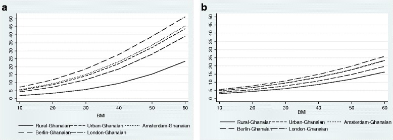 Results: In rural Ghana, the prevalence of obesity was 1.3 % in men and 8.3 % in women. The prevalence was considerably higher in urban Ghana (men, 6.9 %; PR: 5.26, 95 % CI, 2.04-13.57; women, 33.9 %; PR: 4.11, 3.13-5.40) and even more so in Europe, especially in London (men, 21.4 %; PR: 15.04, 5.98-37.84; women, 54.2 %; PR: 6.63, 5.04-8.72). The prevalence of T2D was low at 3.6 % and 5.5 % in rural Ghanaian men and women, and increased in urban Ghanaians (men, 10.3 %; PR: 3.06; 1.73-5.40; women, 9.2 %; PR: 1.81, 1.25-2.64) and highest in Berlin (men, 15.3 %; PR: 4.47; 2.50-7.98; women, 10.2 %; PR: 2.21, 1.30-3.75). Impaired fasting glycaemia prevalence was comparatively higher only in Amsterdam, and in London, men compared with rural Ghana.