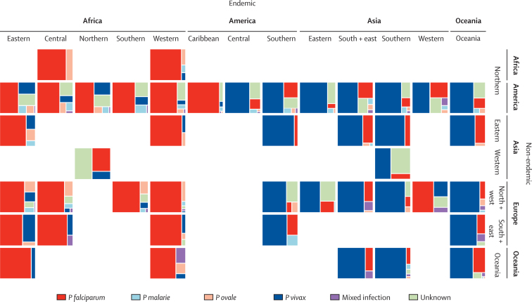 Findings: Infection movements were strongly skewed towards a small number of high-traffic routes between 2005 and 2015, with the west Africa region accounting for 56% (13 947/24 941) of all imported cases to non-endemic countries with a reported travel destination, and France and the UK receiving the highest number of cases, with more than 4000 reported cases per year on average. Countries strongly linked by movements of imported cases are grouped by historical, language, and travel ties. There is strong spatial clustering of plasmodium species types.