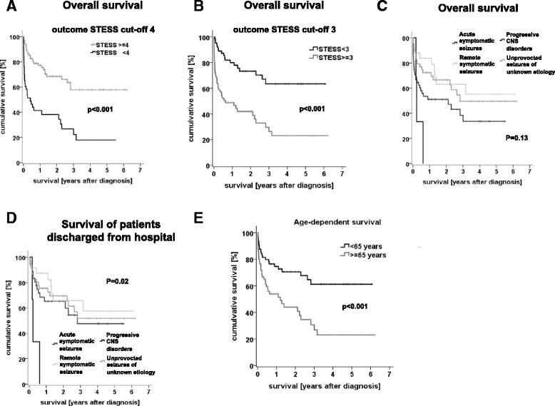 Results: In 94.4 % of patients, SE was treated successfully; in-hospital mortality rate was 12 %. The overall mortality was 42 % after median follow-up of 28.1 months. The survival plateaued after about 3 years, all patients with progressive brain diseases (n = 4) died within one year. In-hospital mortality correlated highly significantly with STESS, the optimal cut-off was 4. With respect to long-term outcome, STESS correlated significantly with overall mortality though with lower odds ratios. When looking only at patients that survived the acute phase of treatment, only the STESS components "level of consciousness" (at admission), "coma" as worst seizure type, and "age" reached a statistical significant association with mortality. In these patients, STESS with a cut-off of 4 was not significantly associated with survival/mortality. Aetiology of SE was insufficient to explain the weak association and the high mortality after discharge alone.