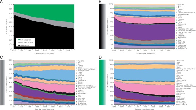 Results: The greatest relative decrease in index-cancer death (generally from > 60% to < 30%) was among those with cancers of the testis, kidney, bladder, endometrium, breast, cervix, prostate, ovary, anus, colorectum, melanoma, and lymphoma. Index-cancer deaths were stable (typically >40%) among patients with cancers of the liver, pancreas, esophagus, and lung, and brain. Noncancer causes of death were highest in patients with cancers of the colorectum, bladder, kidney, endometrium, breast, prostate, testis; >40% of deaths from heart disease. The highest SMRs were from nonbacterial infections, particularly among <50-year olds (e.g. SMR >1,000 for lymphomas, P < 0.001). The highest SMRs were typically within the first year after cancer diagnosis (SMRs 10-10,000, P < 0.001). Prostate cancer patients had increasing SMRs from Alzheimer's disease, as did testicular patients from suicide.