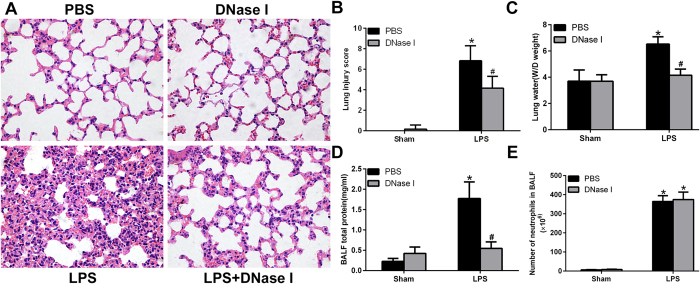 Neutrophil extracellular traps (NETs) facilitate the extracellular killing of pathogens. However, excessive NETs formation and poor degradation are associated with exacerbated immune responses and tissue injury. In this study, we investigated the role of NETs in lipopolysaccharide (LPS)-mediated acute lung injury (ALI) and assessed the use of DNase I, for the treatment of ALI. Additionally, we focused on the controversial issue of whether LPS directly induces NETs release in vitro. NETs formation was detected in murine ALI tissue in vivo and was associated with increased NETs markers, citrullinated-histone H3 tissue levels and NET-DNA levels in BALF. Treatment with DNase I significantly degraded NETs and reduced citrullinated-histone H3 levels, which protected against ALI and ameliorated pulmonary oedema and total protein in BALF. In addition, DNase I significantly reduced IL-6 and TNF-α levels in plasma and BALF. In vitro, LPS-activated platelets rather than LPS alone efficiently induced NETs release. In conclusion, NETs formed during LPS-induced ALI, caused organ damage and initiated the inflammatory response. NETs degradation by DNase I promoted NET-protein clearance and protected against ALI in mice; thus, DNase I may be a new potential adjuvant for ALI therapy. Specifically, LPS induced NETs formation in an indirect manner via platelets activation.