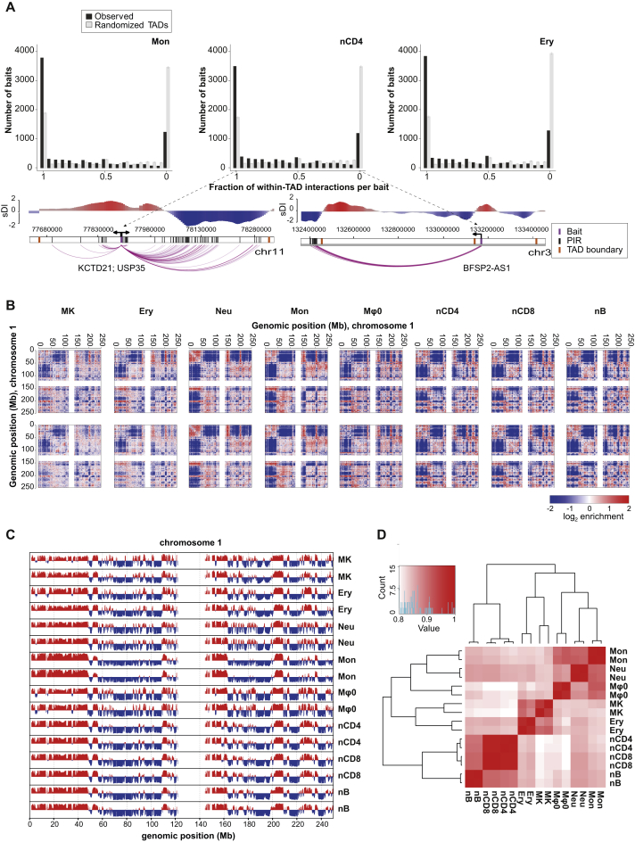 Long-range interactions between regulatory elements and gene promoters play key roles in transcriptional regulation. The vast majority of interactions are uncharted, constituting a major missing link in understanding genome control. Here, we use promoter capture Hi-C to identify interacting regions of 31,253 promoters in 17 human primary hematopoietic cell types. We show that promoter interactions are highly cell type specific and enriched for links between active promoters and epigenetically marked enhancers. Promoter interactomes reflect lineage relationships of the hematopoietic tree, consistent with dynamic remodeling of nuclear architecture during differentiation. Interacting regions are enriched in genetic variants linked with altered expression of genes they contact, highlighting their functional role. We exploit this rich resource to connect non-coding disease variants to putative target promoters, prioritizing thousands of disease-candidate genes and implicating disease pathways. Our results demonstrate the power of primary cell promoter interactomes to reveal insights into genomic regulatory mechanisms underlying common diseases.