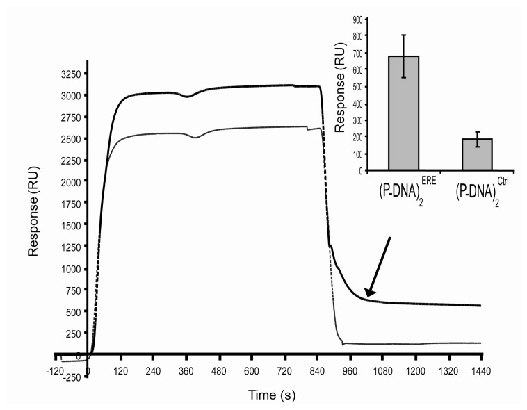 We constructed an original supramolecular assembly on a surface of sensor composed of an innovative combination of an engineered cytochrome b5 and a modified nucleic acid bound to a synthetic lipid hemimembrane. The protein/DNA block, called (PDNA) 2, was synthesized and purified before its immobilization onto a hybrid bilayer reconstituted on a gold surface. Surface plasmon resonance (SPR) and atomic force microscopy (AFM) were engaged in parallel on the same substrates in order to better understand dynamic events that occur at the surface of the biosensor. Good correlations were obtained in terms of specificity and reversibility. These findings allow us to present a first application of such biosensor in the study of the interaction processes between nuclear receptor and DNA.