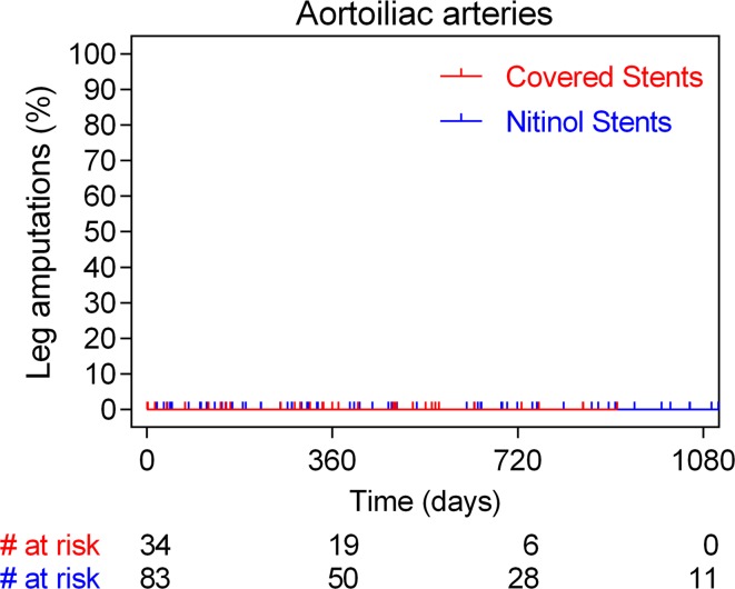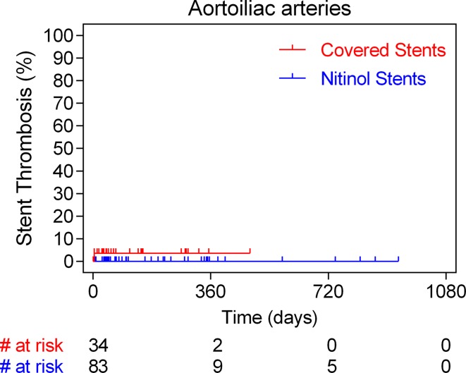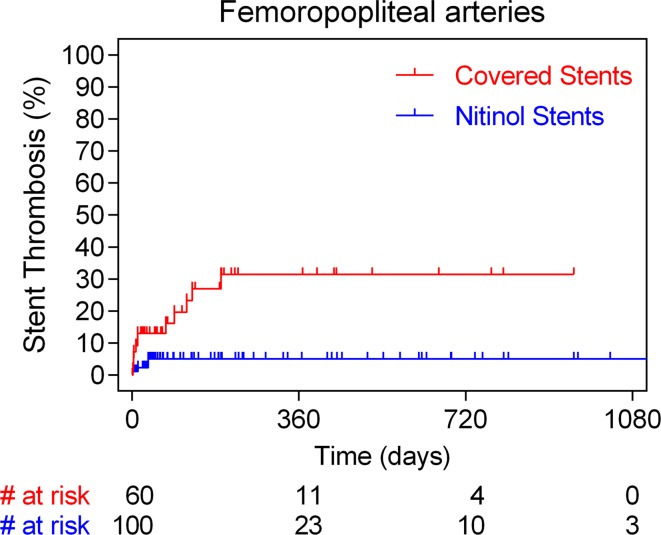 Conclusions: Placement of long femoropopliteal covered nitinol stents is associated with an increased incidence of acute stent thrombosis and ensuing major amputation. Risks are significantly lower in the aortoiliac vessels and with use of bare nitinol stents.