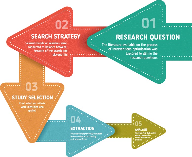 Conclusions: The review identifies a range of optimisation strategies currently used. Although a preliminary classification of these strategies can be proposed, a series of questions remain as to which methods to use for different interventions and how to determine when the intervention is ready or 'optimised enough' to be tested in a RCT. Future research should explore potential answers to the questions raised, to guide researchers in the development and evaluation of more effective interventions.