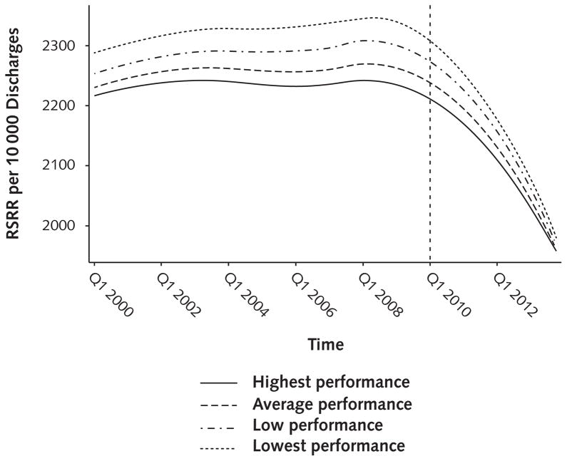 Results: Of 2868 hospitals serving 1 109 530 Medicare discharges annually, 30.1% were highest performers, 44.0% were average performers, 16.8% were low performers, and 9.0% were lowest performers. After controlling for prelaw trends, an additional 67.6 (95% CI, 66.6 to 68.4), 74.8 (CI, 74.0 to 75.4), 85.4 (CI, 84.0 to 86.8), and 95.1 (CI, 92.6 to 97.5) readmissions per 10 000 discharges were found to have been averted per year in the highest-, average-, low-, and lowest-performance groups, respectively, after passage of the law.