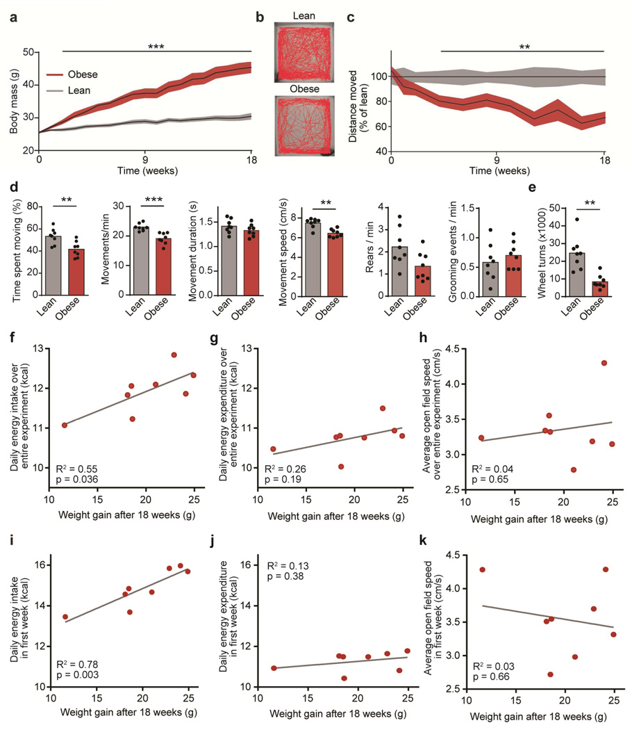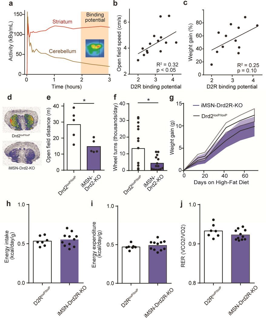 Obesity is associated with physical inactivity, which exacerbates the health consequences of weight gain. However, the mechanisms that mediate this association are unknown. We hypothesized that deficits in dopamine signaling contribute to physical inactivity in obesity. To investigate this, we quantified multiple aspects of dopamine signaling in lean and obese mice. We found that D2-type receptor (D2R) binding in the striatum, but not D1-type receptor binding or dopamine levels, was reduced in obese mice. Genetically removing D2Rs from striatal medium spiny neurons was sufficient to reduce motor activity in lean mice, whereas restoring Gi signaling in these neurons increased activity in obese mice. Surprisingly, although mice with low D2Rs were less active, they were not more vulnerable to diet-induced weight gain than control mice. We conclude that deficits in striatal D2R signaling contribute to physical inactivity in obesity, but inactivity is more a consequence than a cause of obesity.