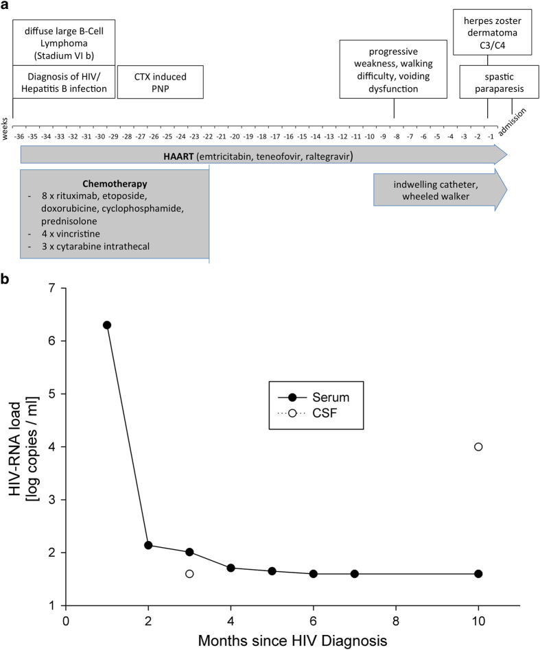 Case presentation: A 49-year-old man felt progressive weakness, and difficulties while walking, and he suffered from incomplete voiding. A week before admission, follicles appeared on the right side of his neck and shoulder. His medical history included a chronic HIV infection treated with HAART and a B-cell lymphoma in complete remission after chemotherapy. The initial exam revealed thoracic hyposensitivity level distal to dermatome Th9, spastic paraparesis of the lower limbs and herpes zoster infection in dermatome C3/C4. A lesion of the thoracic myelon could be ruled out in the MRI scan, chemotherapy-induced polyneuropathy was stable, and no acute opportunistic infection of the CNS was found. HIV load in cerebrospinal fluid (CSF) was markedly elevated. An HIV-associated vacuolar myelopathy was diagnosed, revealing the HIV itself as etiology.