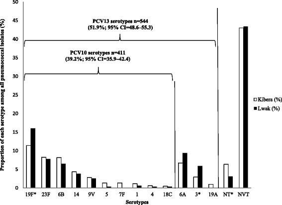 Conclusions: Before PCV10 introduction, nearly all Kenyan children aged <5 years were colonized with pneumococci, and PCV10 serotype colonization was common. PCV10 serotypes were associated with penicillin nonsusceptibility. Given that colonization with PCV10 serotypes is associated with greater risk for invasive disease than colonization with other serotypes, successful PCV10 introduction in Kenya is likely to have a substantial impact in reducing vaccine-type pneumococcal disease and drug-resistant pneumococcal infection.