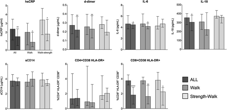 Results: Forty-nine patients were included and 35 (71%) completed the program: 21 in the walk and 14 in the strength-walk group. At W12, significant improvements were observed of body mass index, waist and hip circumference, and total cholesterol both overall and in the walk group, and of LDL cholesterol in both training groups. In the whole group, significant reductions were observed in hsCRP, IL-6, D-dimer, IL-18, and of CD8+/CD38+/HLA-DR+ cell frequencies. HsCRP and CD8+/CD38+/HLA-DR+ frequency decreased significantly in both training groups when examined separately whereas IL-6 and D-dimer in the walk group only.