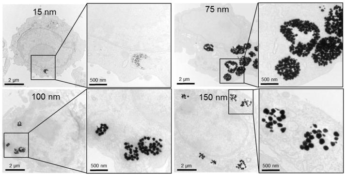 With advances in cell therapies, interest in cell tracking techniques to monitor the migration, localization, and viability of these cells continues to grow. X-ray computed tomography (CT) is a cornerstone of medical imaging but has been limited in cell tracking applications due to its low sensitivity toward contrast media. In this study, we investigate the role of size and surface functionality of gold nanoparticles for monocyte uptake to optimize the labeling of these cells for tracking in CT. We synthesized gold nanoparticles (AuNP) that range from 15 to 150 nm in diameter and examined several capping ligands, generating 44 distinct AuNP formulations. In vitro cytotoxicity and uptake experiments were performed with the RAW 264.7 monocyte cell line. The majority of formulations at each size were found to be biocompatible, with only certain 150 nm PEG functionalized particles reducing viability at high concentrations. High uptake of AuNP was found using small capping ligands with distal carboxylic acids (11-MUA and 16-MHA). Similar uptake values were found with intermediate sizes (50 and 75 nm) of AuNP when coated with 2000 MW poly(ethylene-glycol) carboxylic acid ligands (PCOOH). Low uptake values were observed with 15, 25, 100, and 150 nm PCOOH AuNP, revealing interplay between size and surface functionality. Transmission electron microscopy (TEM) and CT performed on cells revealed similar patterns of high gold uptake for 50 nm PCOOH and 75 nm PCOOH AuNP. These results demonstrate that highly negatively charged carboxylic acid coatings for AuNP provide the greatest internalization of AuNP in monocytes, with a complex dependency on size.