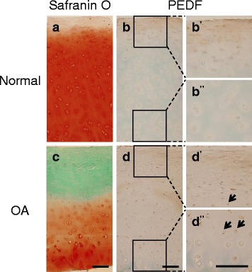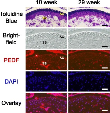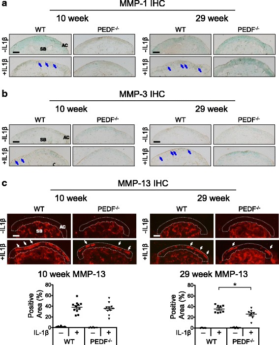 Results: We showed that PEDF protein levels were higher in human osteoarthritis samples compared to normal samples. We demonstrated that ectopic PEDF expression in primary human articular chondrocytes exacerbated catabolic gene expression in the presence of IL-1β. In whole bone organ cultures, IL-1β induced MMP-1, MMP-3 and MMP-13 protein production, and caused significant cartilage matrix loss. Interestingly, Toluidine Blue staining showed that PEDF-deficient bones from 29 week old animals, but not 10 week old animals, had reduced matrix loss in response to IL-1β compared to their wild type counterparts. In addition, PEDF-deficiency in 29 week old animals preserved matrix integrity and protected against cell loss in the MIA joint destruction model in vivo.