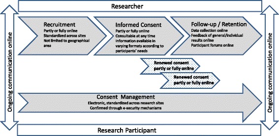 Conclusions: Dynamic Consent offers opportunities for ongoing communication between researchers and research participants that can positively impact research. Dynamic Consent supports inter-sector, cross-border approaches and large scale data-sharing. Whilst it is relatively easy to set up and maintain, its implementation will require that researchers re-consider their relationship with research participants and adopt new procedures.