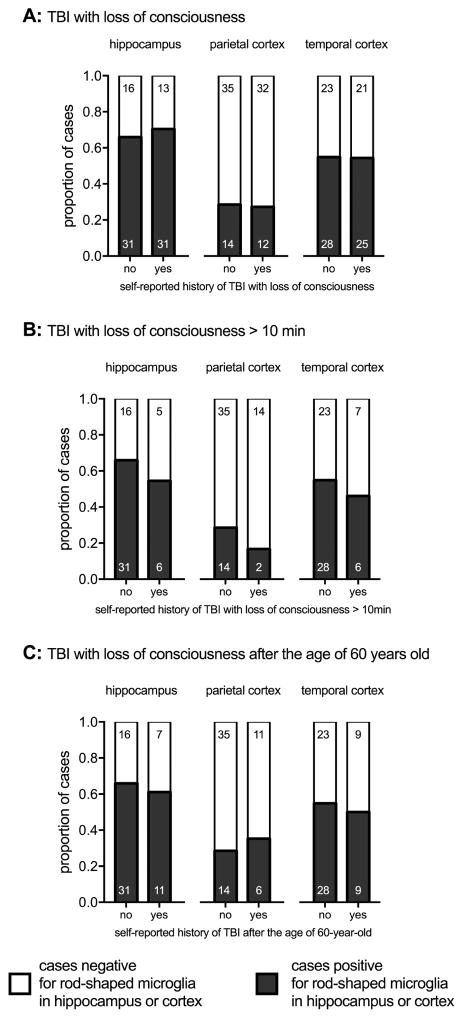 A subtype of microglia is defined by the morphological appearance of the cells as rod shaped. Little is known about this intriguing cell type, as there are only a few case reports describing rod-shaped microglia in the neuropathological literature. Rod-shaped microglia were shown recently to account for a substantial proportion of the microglia cells in the hippocampus of both demented and cognitively intact aged individuals. We hypothesized that aging could be a defining feature in the occurrence of rod-shaped microglia. To test this hypothesis, 2 independent series of autopsy cases (total n = 168 cases), which covered the adult lifespan from 20 to 100+ years old, were included in the study. The presence or absence of rod-shaped microglia was scored on IBA1 immunohistochemically stained slides for the hippocampus and cortex. We found that age was one of the strongest determinants for the presence of rod-shaped microglia in the hippocampus and the cortex. We found no association with the presence of rod-shaped microglia and a self-reported history of a TBI. Alzheimer's disease-related pathology was found to influence the presence of rod-shaped microglia, but only in the parietal cortex and not in the hippocampus or temporal cortex. Future studies are warranted to determine the functional relevance of rod-shaped microglia in supporting the health of neurons in the aged brain, and the signaling processes that regulate the formation of rod-shaped microglia.