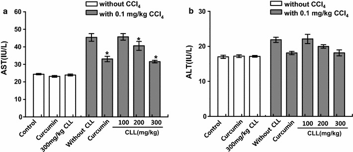 Methods: Acute hepatic stress was induced by a single intraperitoneal injection of CCl4 (0.1 ml/kg body weight) in rats. CLL extract was administered once a day for 3 days at three dose levels (100, 200, and 300 mg/kg/day) and curcumin was administered once a day at the 200 mg/kg/day. We performed alanine transaminase (ALT) and aspartate transaminase (AST). activity analysis and also measured total lipid, triglyceride, and cholesterol levels, and lipid peroxidation.