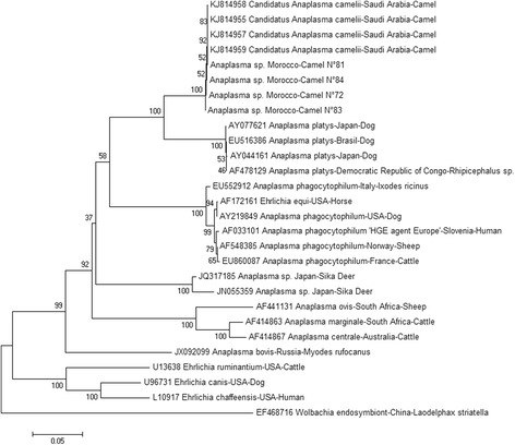Conclusion: This study demonstrates the circulation of a previously unidentified species of the genus Anaplasma in Morocco which is genetically close to the agent causing canine anaplasmosis but whose main reservoir is thought to be Camelus dromedarius.
