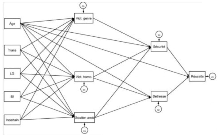 Cet article étudie la victimisation homophobe et liée à la non-conformité de genre et ses effets sur l’adaptation scolaire et psychosociale de jeunes Québécois. Un échantillon non probabiliste de 262 jeunes (173 filles, 89 garçons), âgés de 14 à 22 ans (M = 17,9 ans) a été constitué. Des comparaisons bivariées et un modèle d’équations structurales ont été réalisés. Les jeunes LGBTQ affichent un sentiment de sécurité à l’école et une réussite scolaire autoévaluée plus faibles et un niveau de détresse psychologique plus élevé. Les résultats montrent que la victimisation homophobe, le soutien social des amis, la détresse psychologique et le sentiment de sécurité à l’école jouent un rôle médiateur important dans la réussite scolaire autoévaluée des jeunes LGBTQ. Ces constats appuient l’importance de mettre en place des interventions pour réduire l’homophobie dans les écoles et soulignent le rôle central des pairs dans cet effort.