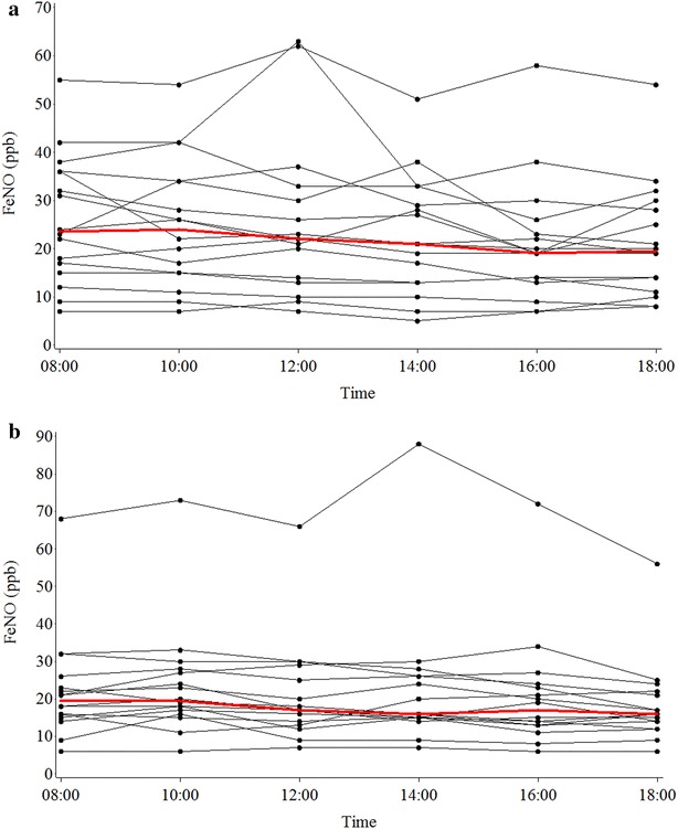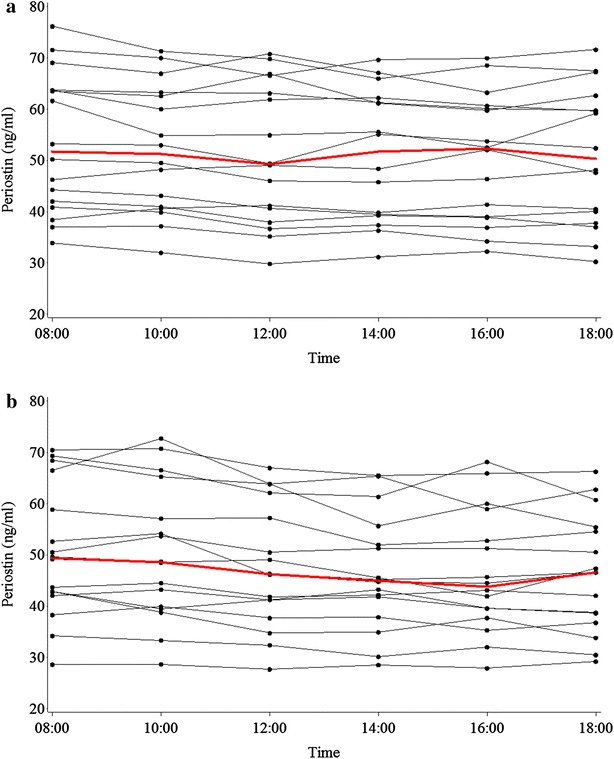 Methods: Serum periostin was measured at 2-h intervals from 0800 to 1800 h in 16 adult participants with stable asthma prescribed inhaled corticosteroid and long-acting beta-agonist therapy, and in 16 otherwise healthy participants without asthma. Mixed linear models were used to compare time zero (08:00 h) with subsequent measurement time for serum periostin for both groups.