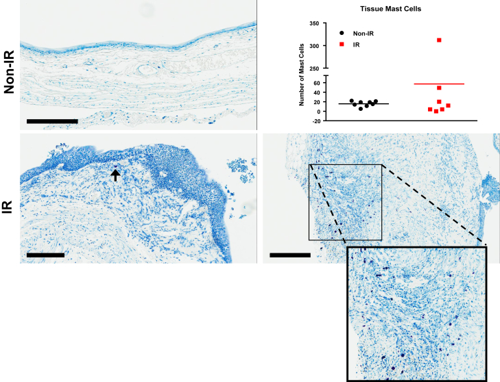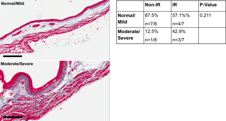 Results: Radiation was well tolerated as no change in weight was observed in the weeks post treatment, and there was no hair loss at the irradiation sites. Starting at 17 weeks post treatment, micturition frequency was significantly higher in irradiated mice versus control animals. Pathological changes include fibrosis, inflammation, urothelial thinning and necrosis. At a site of severe insult, we observed telangiectasia, absence of Uroplakin-3 and E-cadherin relocalization.