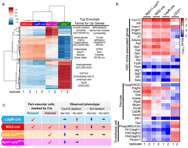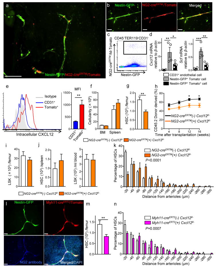 Arterioles and sinusoids of the bone marrow (BM) are accompanied by stromal cells that express nerve/glial antigen 2 (NG2) and leptin receptor (LepR), and constitute specialized niches that regulate quiescence and proliferation of haematopoietic stem cells (HSCs). However, how niche cells differentially regulate HSC functions remains unknown. Here, we show that the effects of cytokines regulating HSC functions are dependent on the producing cell sources. Deletion of chemokine C-X-C motif ligand 12 (Cxcl12) or stem cell factor (Scf) from all perivascular cells marked by nestin-GFP dramatically depleted BM HSCs. Selective Cxcl12 deletion from arteriolar NG2+ cells, but not from sinusoidal LepR+ cells, caused HSC reductions and altered HSC localization in BM. By contrast, deletion of Scf in LepR+ cells, but not NG2+ cells, led to reductions in BM HSC numbers. These results uncover distinct contributions of cytokines derived from perivascular cells in separate vascular niches to HSC maintenance.