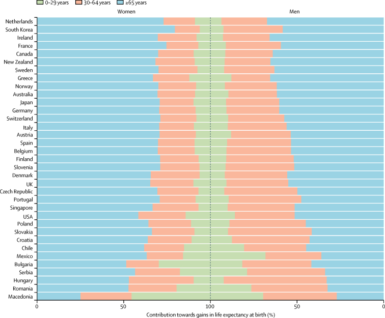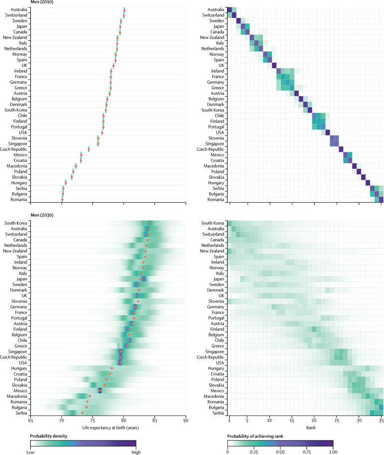 Findings: Life expectancy is projected to increase in all 35 countries with a probability of at least 65% for women and 85% for men. There is a 90% probability that life expectancy at birth among South Korean women in 2030 will be higher than 86·7 years, the same as the highest worldwide life expectancy in 2012, and a 57% probability that it will be higher than 90 years. Projected female life expectancy in South Korea is followed by those in France, Spain, and Japan. There is a greater than 95% probability that life expectancy at birth among men in South Korea, Australia, and Switzerland will surpass 80 years in 2030, and a greater than 27% probability that it will surpass 85 years. Of the countries studied, the USA, Japan, Sweden, Greece, Macedonia, and Serbia have some of the lowest projected life expectancy gains for both men and women. The female life expectancy advantage over men is likely to shrink by 2030 in every country except Mexico, where female life expectancy is predicted to increase more than male life expectancy, and in Chile, France, and Greece where the two sexes will see similar gains. More than half of the projected gains in life expectancy at birth in women will be due to enhanced longevity above age 65 years.