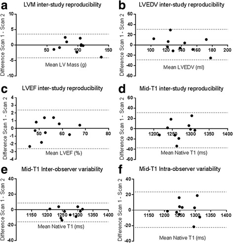 Methods: Using 3 Tesla CMR, we report the results of 1) the inter-study, inter-observer and intra-observer reproducibility of native T1 mapping in 10 hemodialysis patients; 2) inter-study reproducibility of left ventricular (LV) structure and function in 10 hemodialysis patients; 3) the agreement of native T1 map and native T1 phantom analyses between two centres in 20 hemodialysis patients; 4) the effect of changes in markers of fluid status on native T1 values in 10 hemodialysis patients.